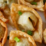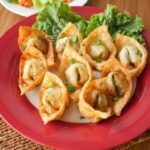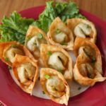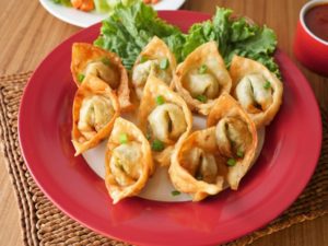 Apply egg on one side of triangle and overlap to form wonton shape (makes 25-30).