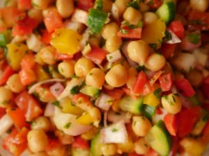 In bowl,add chickpeas,carrot,cucumber,onion,tomato,yellow bell pepper,fresh coriander,mint leaves and drizzle lemon & garlic dressing,mix well & serve.