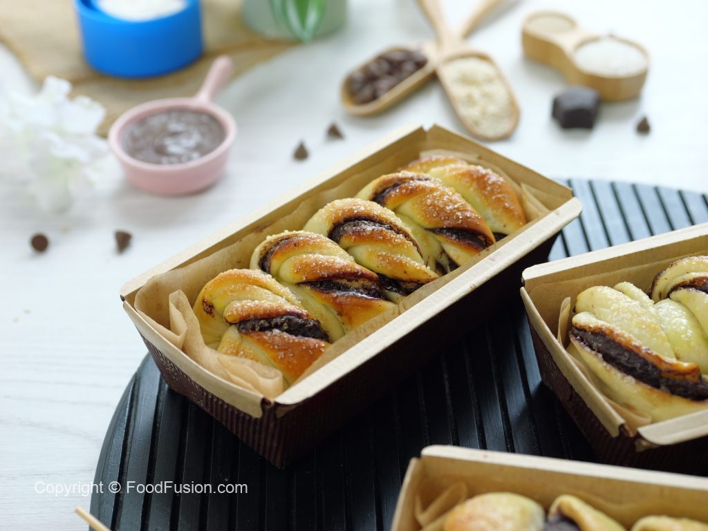 -Chocolate spread ko rolled dough per dal ker pheela lein aur ek side ko flip ker lein.