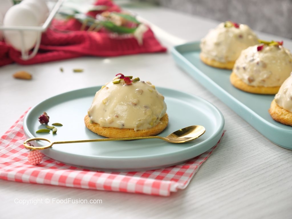 -Pista aur badam dal ker gently fold ker lein aur piping bag mein transfer ker lein.