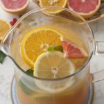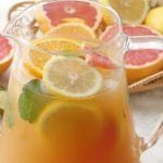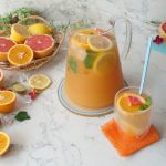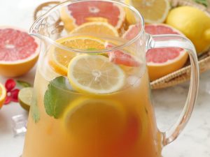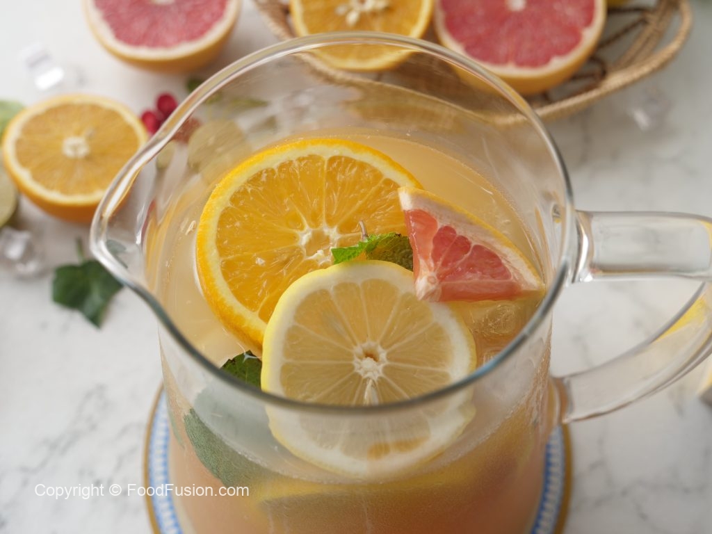 In a jug,add ice cubes,lemon slices,orange slices,grape fruit slices,prepared lemon green tea,grape fruit juice,orange juice,lemon juice and mint leaves,stir & serve!