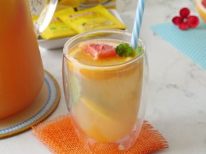 Jug mein ice cubes,lemon slices,orange slices,grape fruit slices,tayyar lemon green tea,grape fruit juice,orange juice,lemon juice aur podina dal ker stir ker lein & serve karein!