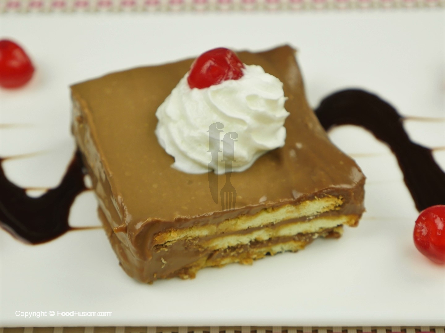 Garnish with chocolate sauce, cherries/strawberries, whipped cream and serve.