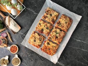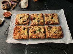 Add cheddar cheese,mozzarella cheese,black olives,pickled jalapenos,dried oregano & red chilli crushed (makes 2 pizzas).