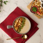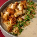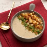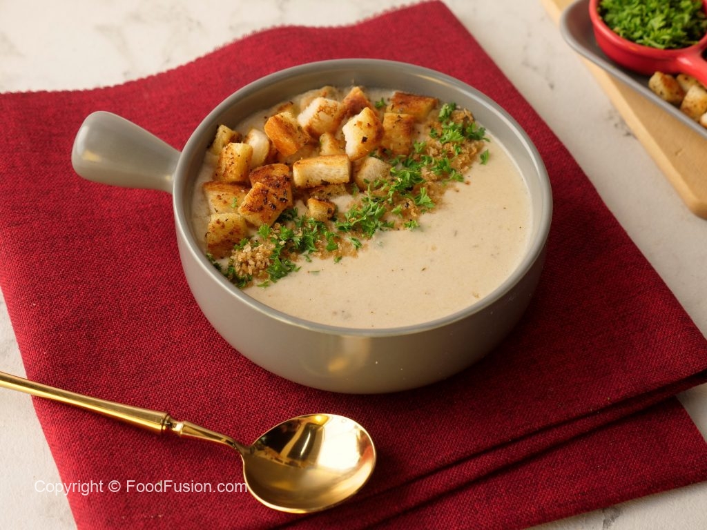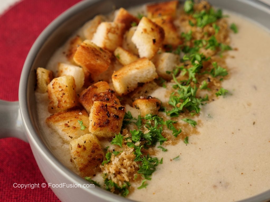 A perfect soup recipe to warm you up this winter season. Cream of Chicken Soup recipe with Crispy Garlic Croutons to go with it #HappyCookingToYou #FoodFusion #OlpersCream