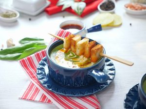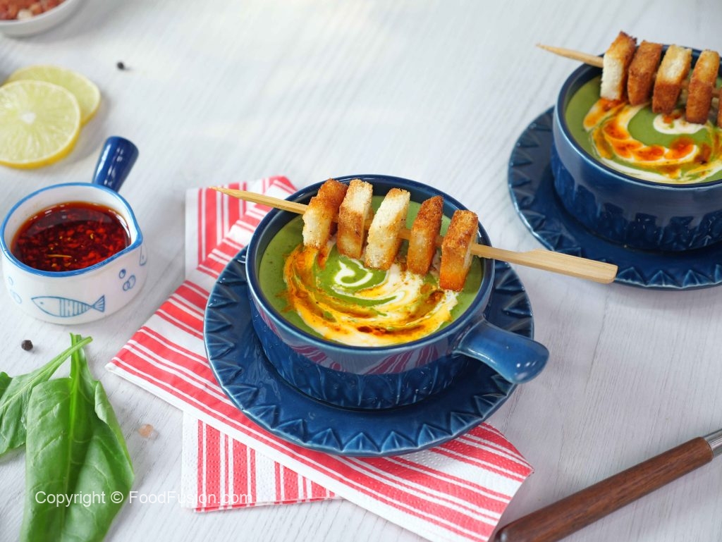 -Serving bowl mein cream of spinach soup dal kar cream aur chilli oil se garnish karein aur croutons ke saath serve karein!