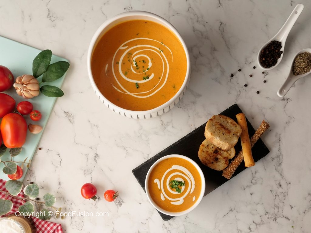 This quick, easy Creamy Tomato Soup is comfort in a bowl, especially when it is topped with the goodness of Olper’s Dairy Cream. #OlpersDairyCream #GoodnessBarhjaye #FoodFusion #DigitalAmmi #HappyCookingToYou
