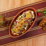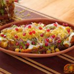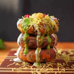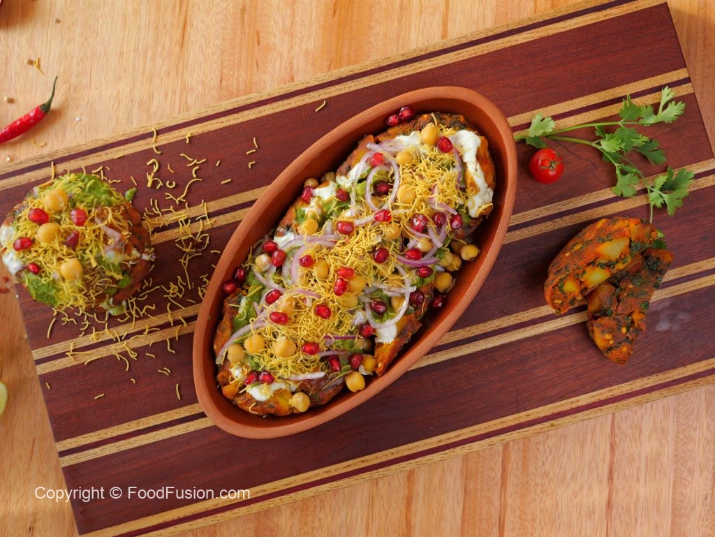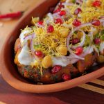 -In a serving plate add fried Aloo tikki, smashed it, add boiled white chickpea, yogurt, gur imli chutney, prepared green chutney, onions, boiled white chickpea, daal sev, pomegranate corns & serve!