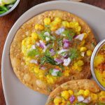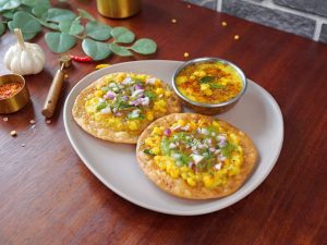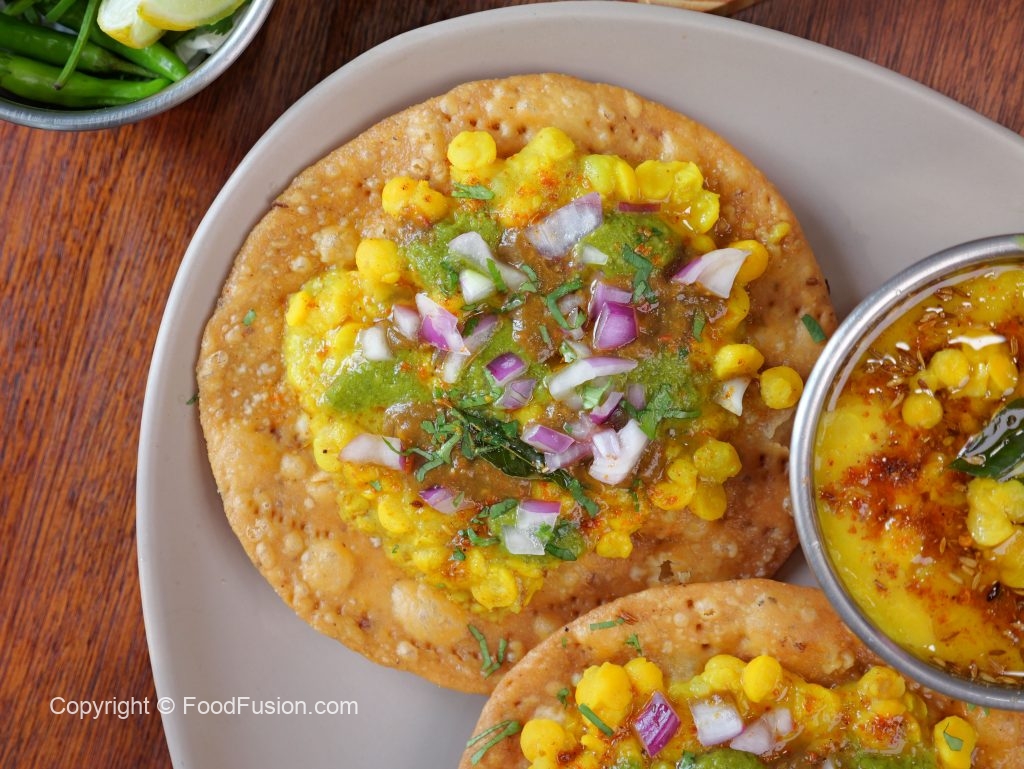 -On a fried pakwan, add prepared daal, spice mix, hari chutney, imli ki chutney, onion & garnish it with fresh coriander, & lemon wedges.