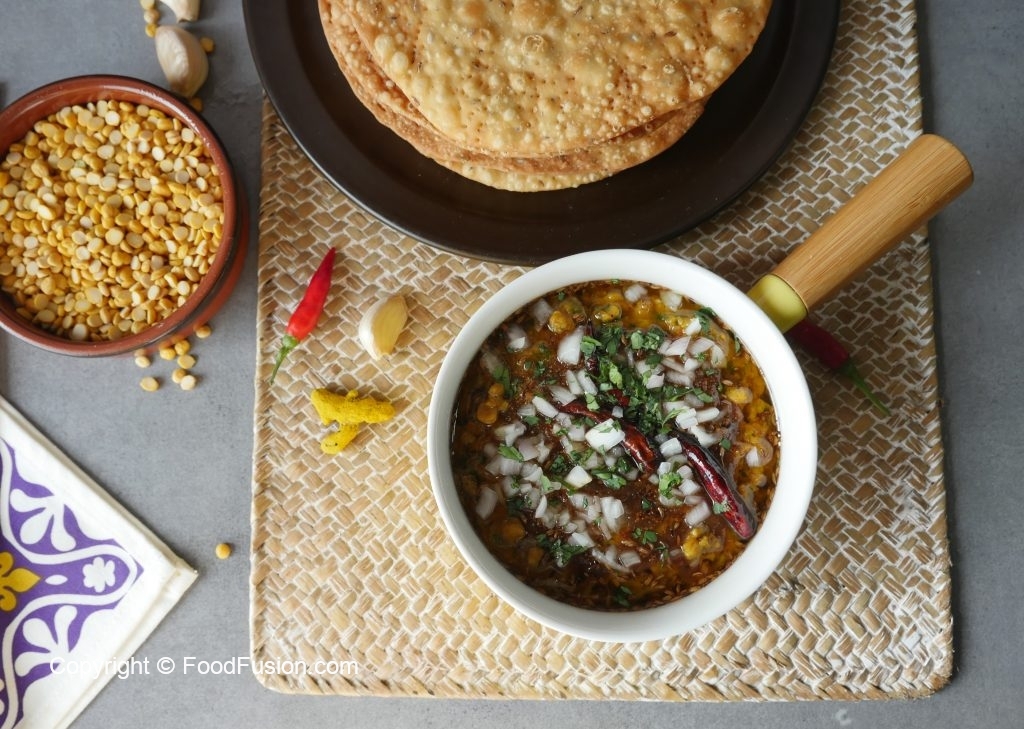 Take out cooked daal in a serving dish,add tamarind pulp,chaat masala,pour tadka,add onion,fresh coriander & serve!