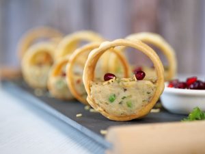 -Serve deconstructed samosa chaat with pomegranate,nimco sev,tomato,onion,chickpeas,green chutney & imli chutney.