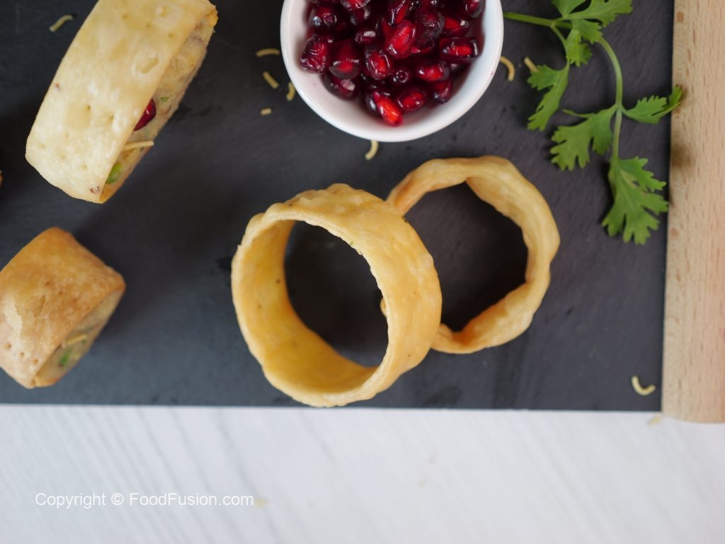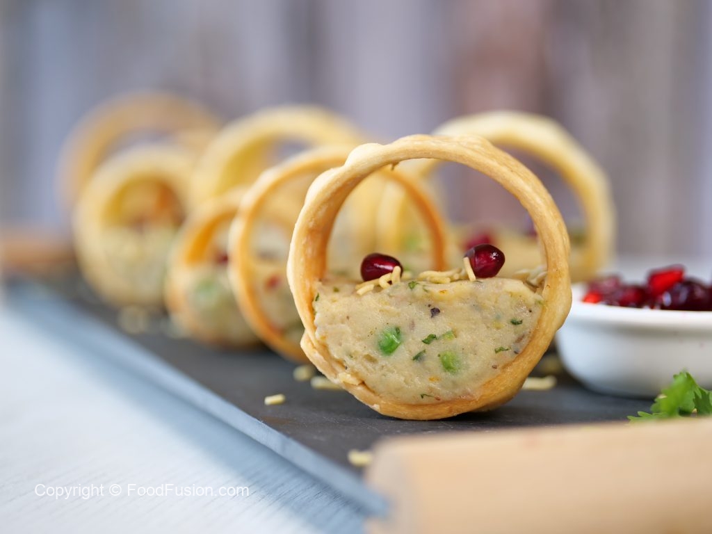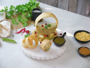-Deconstructed samosa chaat ko anar,nimco sev,tamatar,pyaz,chanay,green chutney & imli chutney ka saath serve karein!