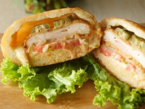 Place cheddar cheese slice,jalapenos,chicken patty,pickled cucumber,tomato slice,prepared sauce, mozzarella cheese slice,gather and seal all edges.