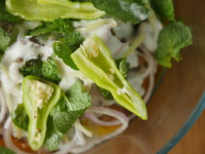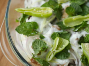 Dish out in a serving dish,add onion rings,yogurt,ginger,mint leaves and green chilies.