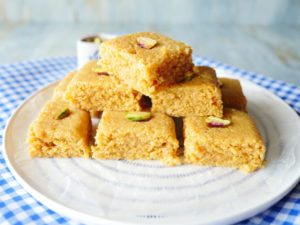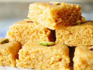 Cut into desired shapes,garnish with pistachios & serve.