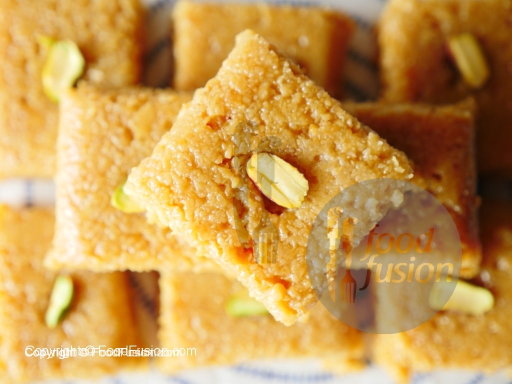 Desired shapes mein cut karein aur pista sa garnish ker ka serve karein.