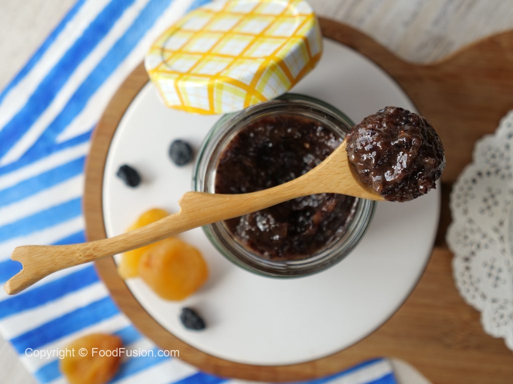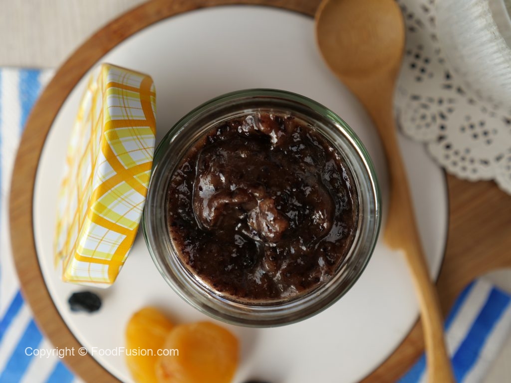 -In a bowl,add dried apricots,black raisins,hot water,cover & soak for 25-30 minutes then strain & blend well with the help of blender.