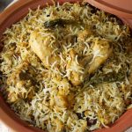 -Cooking pot mein chawal ki thin layer laga lein,marinated chicken,remaining boiled chawal,garam masala powder,podina, hara dhania,fried pyaz aur ghee dal dein.