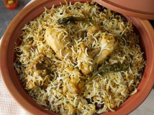 -In a cooking pot,spread thin layer of rice,marinated chicken,remaining boiled rice,garam masala powder,mint leaves, fresh coriander,fried onion & clarified butter.