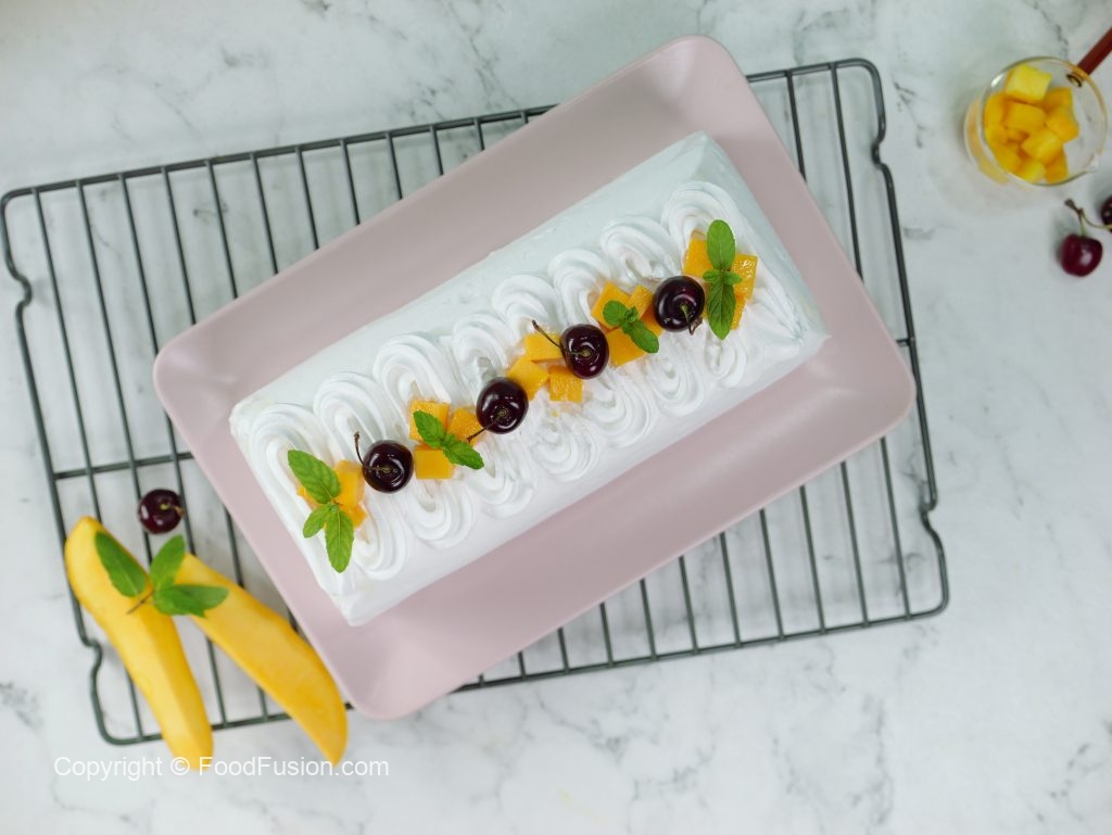 -Decorate with whipped cream,mango chunks,cherries & mint leaves.