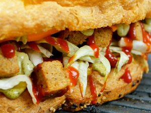 -On a toasted croissants,add & spread prepared sauce,lettuce leaves,tomato slices,cheddar cheese slices,mortadella slices,scrambled egg & cover with another croissant on top (makes 2).