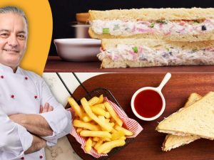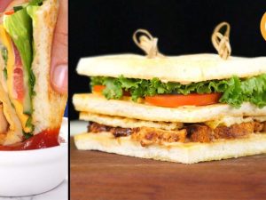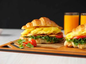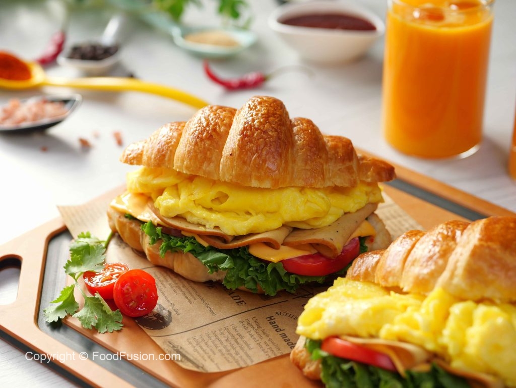 -Toasted croissant par tayyar sauce,salad patta,tamatar slices,cheddar cheese slices,mortadella slices aur scrambled egg rakh kar doosra croissant upar se rakh dein (makes 2).