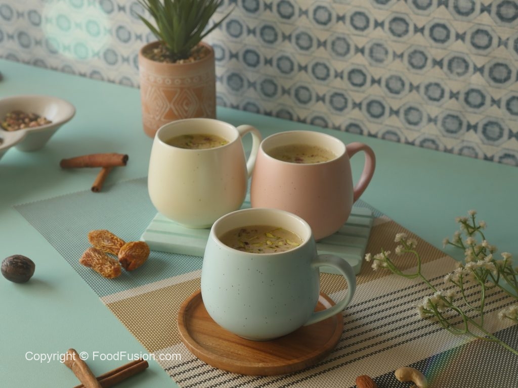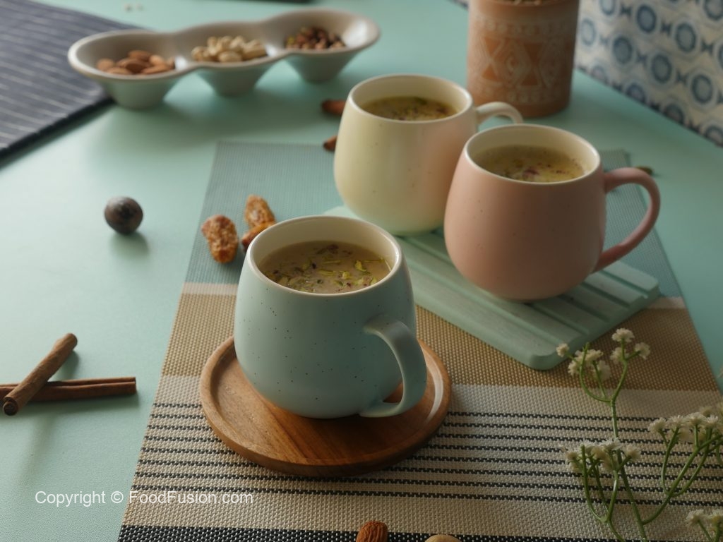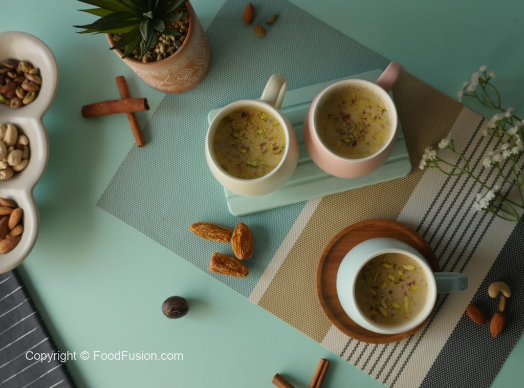 Add pistachios,dry dates,cashew nuts,almonds,green cardamom,cinnamon sticks,nutmeg & roast until fragrant (3-4 minutes) and let it cool.