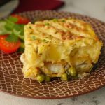 10 x 4 inch ki baking dish may pehle tayar sauce, phir fried fish, mozzarella cheese, cheddar cheese or tayar creamy potato daalen. Spoon ki madad se level karen or design banayen.
