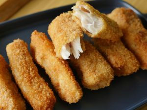 Now coated fish pieces in all-purpose flour mixture then dip into beaten eggs & coat in breadcrumbs.