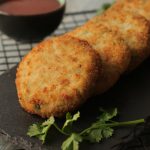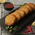Grease hands with oil,take small quantity of mixture (approx. 50-55g) & make kababs of equal sizes then dip into whisked eggs & coat with breadcrumbs (makes 12-15).