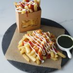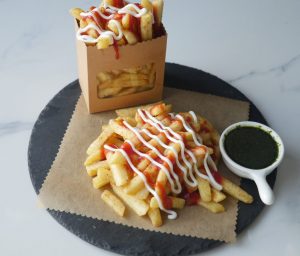 On fries,drizzle tomato ketchup and mayonnaise and serve with green chutney!