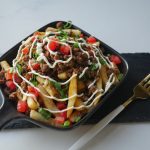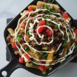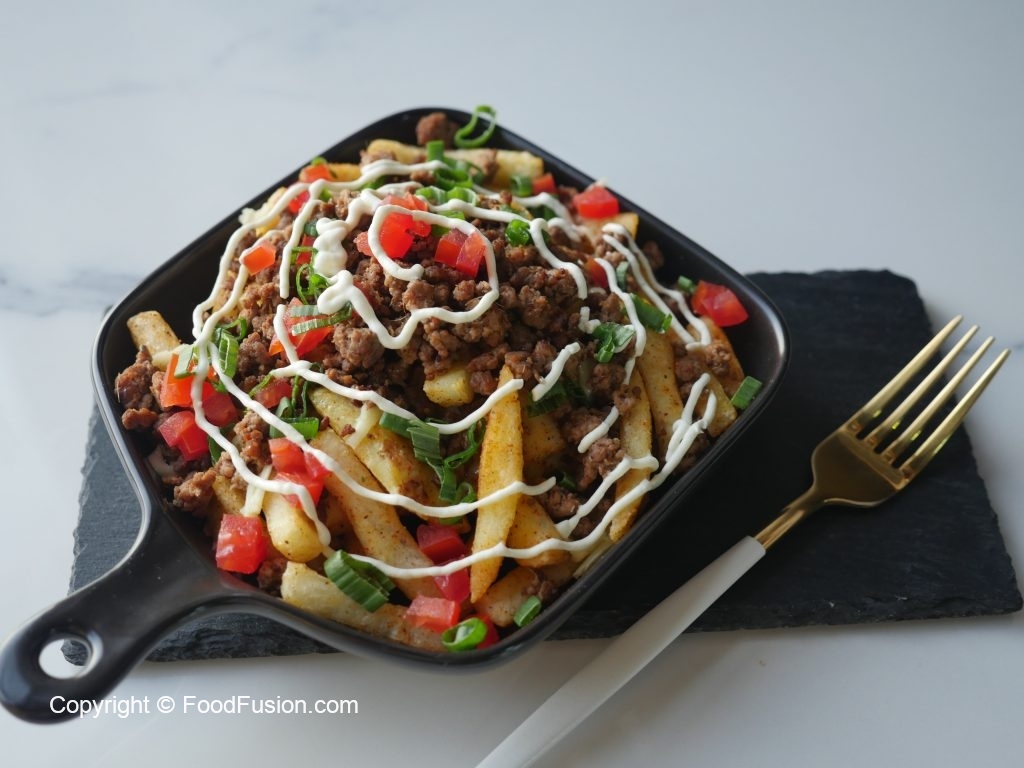 In serving dish,add fries,cheddar cheese,cooked mince,tomato,green onion leaves,sour cream & serve!