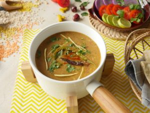 -In a bowl, add yellow lentil flour, gram flour, rice flour, red chilli powder, cumin, pink salt, whisk well.