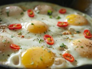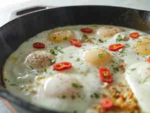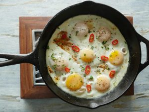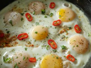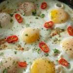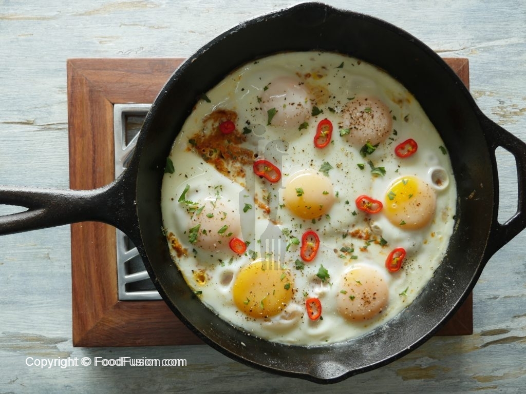 Now add eggs one by one and cook on low flame for 2-3 minutes then cover and steam cook until eggs are done.