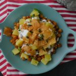 On serving plate,add cooked chickpeas,boiled potato,green chili,yogurt,papri,fresh coriander & serve!
