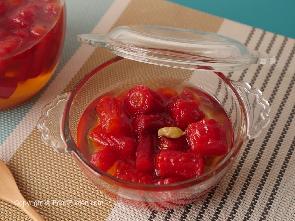 Rinse and peel carrots (While making carrot murabba, use tender juicy carrots and not hard or fibrous carrots and also go for thin carrots as they take less time to cook).