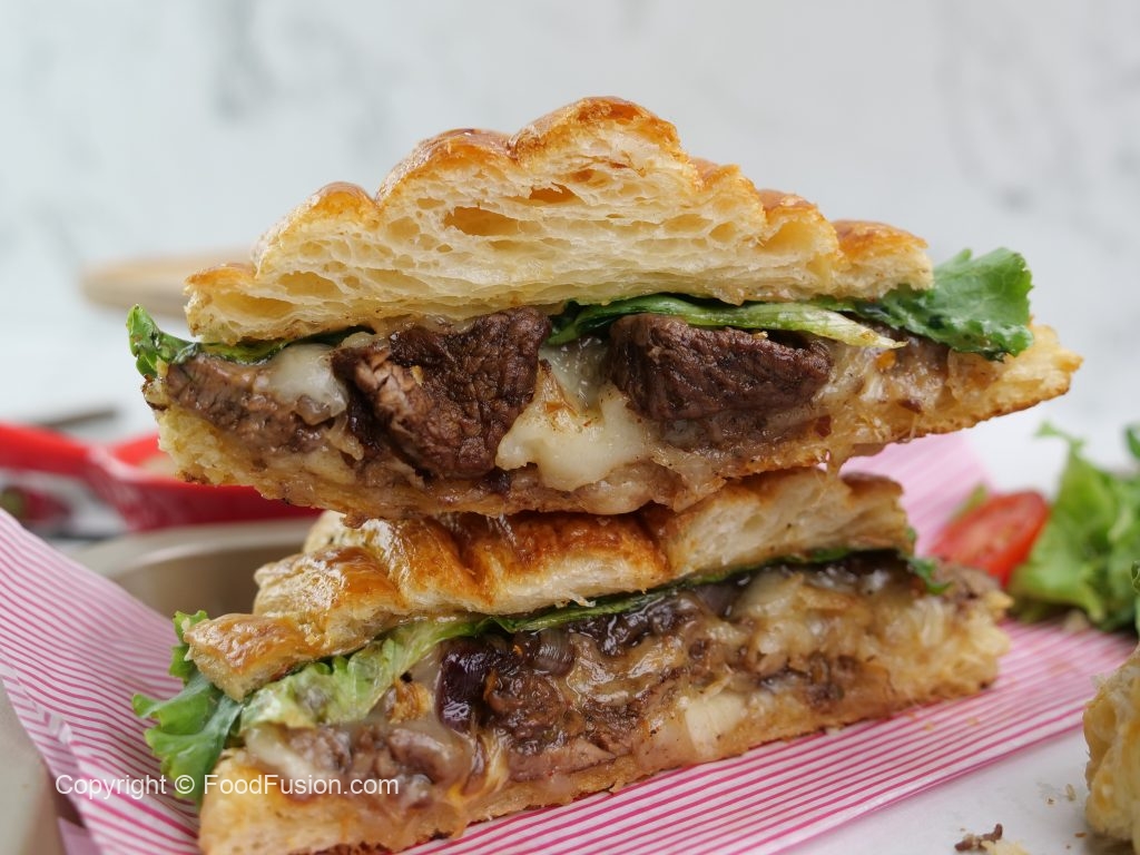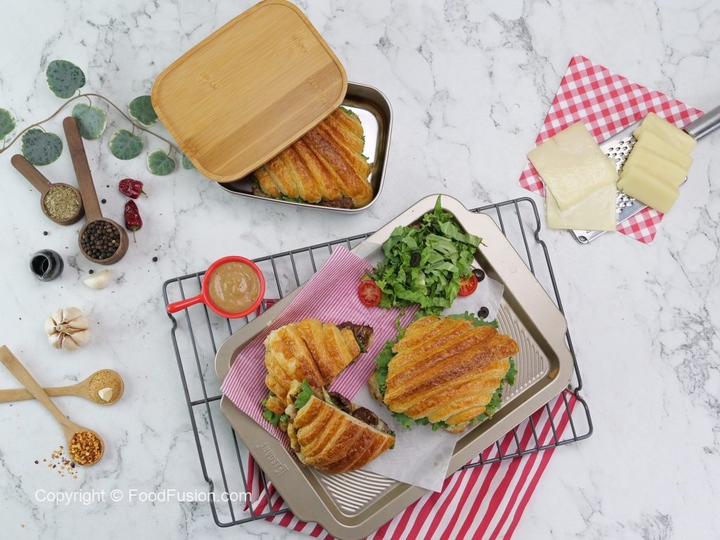 -Tayyar spicy bbq sauce ko top croissant per dal dein & flip ker ka sandwich tayyar ker lein (makes 3-4).