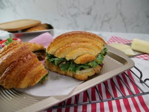 -Add prepared spicy bbq sauce on top croissant & flip to make a sandwich (makes 3-4).