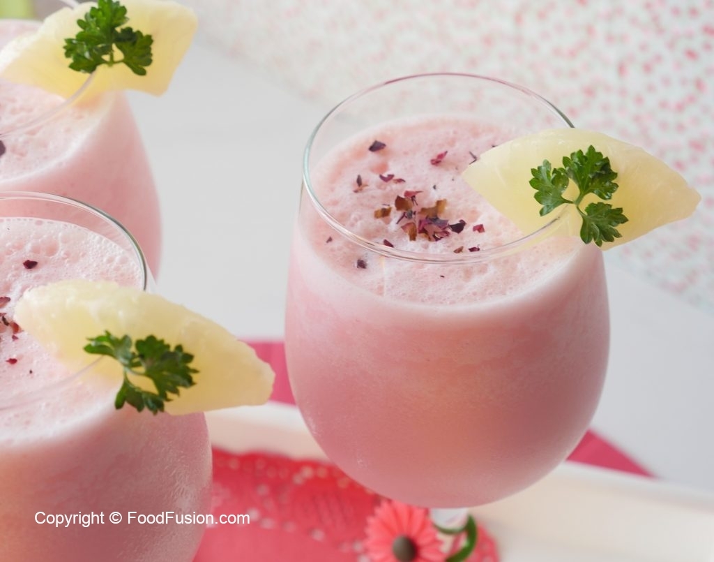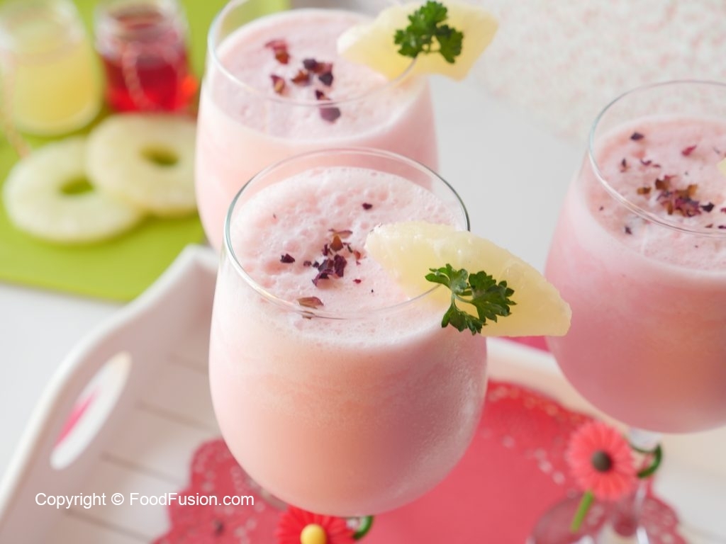 In blender jar,add pineapple chunks,pineapple syrup,milk,qarshi jam-e-shirin,coconut milk powder and blend well.