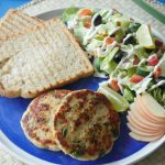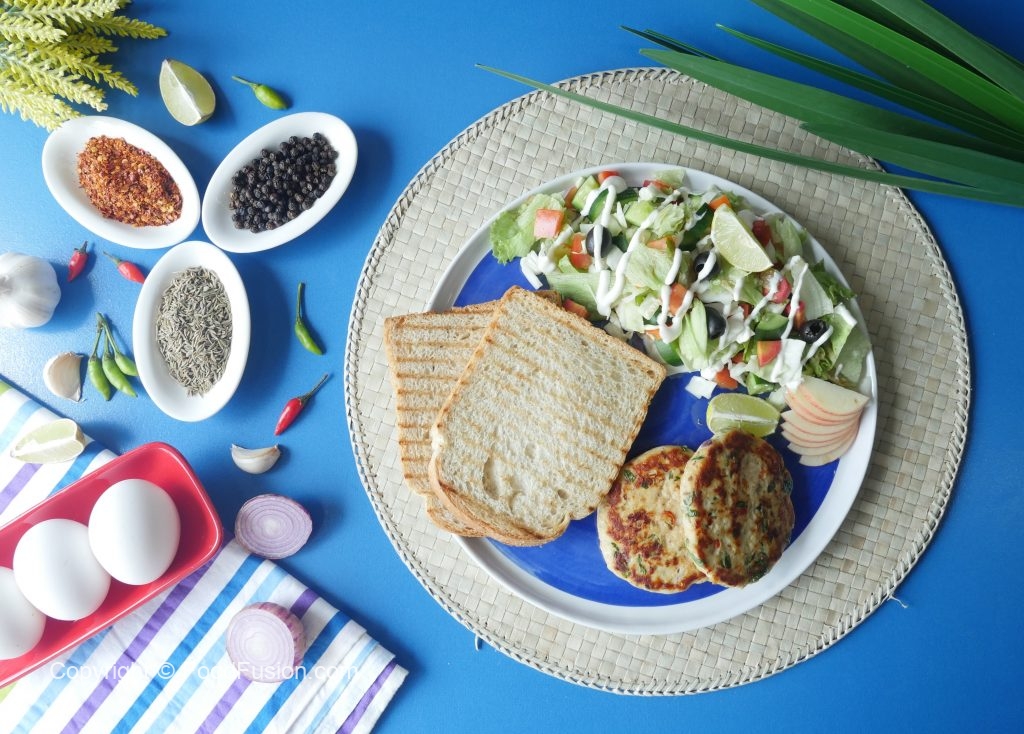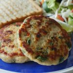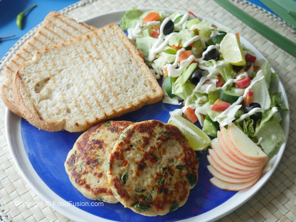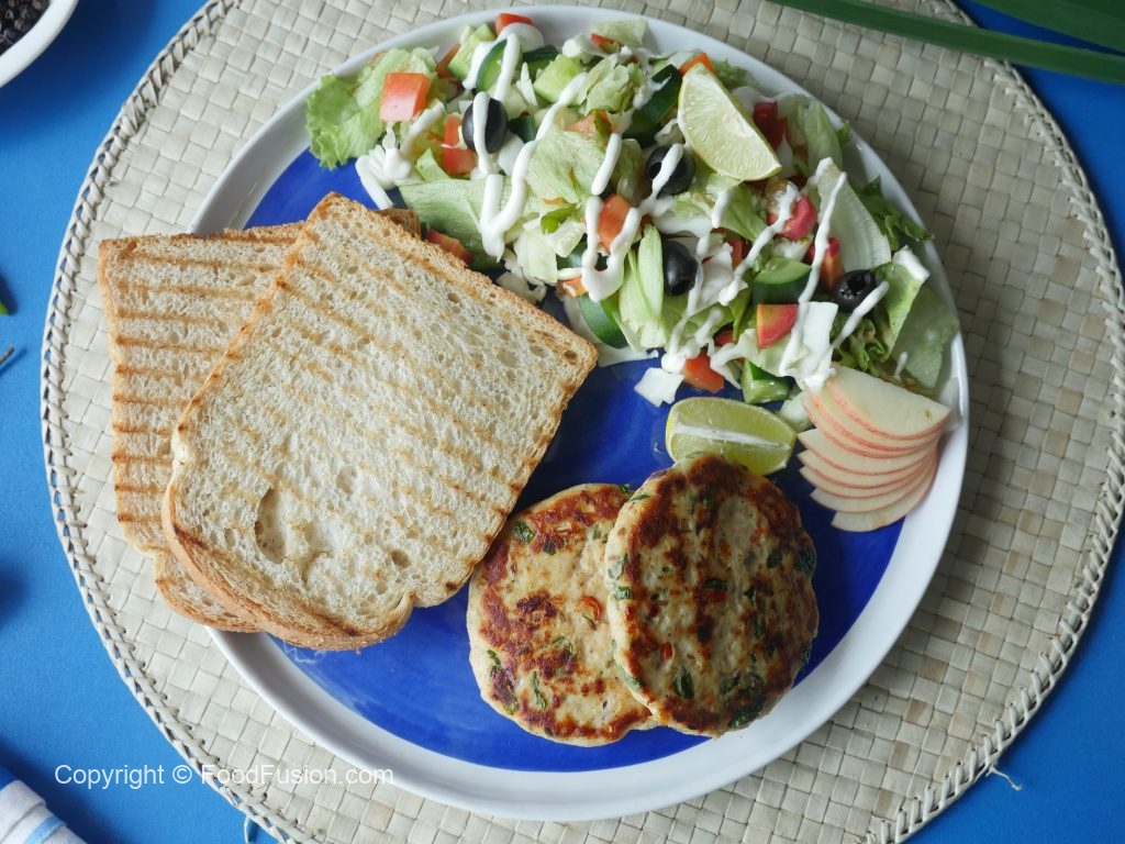 Serve healthy chicken patties with toasted bran bread & salad.