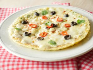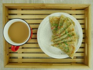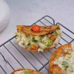 -In a greased pan add tortilla (upside down), cook on medium flame for 2-3 minutes, flip it then cook for 1-2 minutes or until light golden & crispy.
