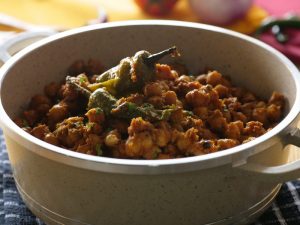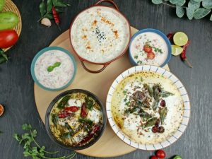Aam,kheera aur tamatar ko chota cubes mein cut ker lein.
