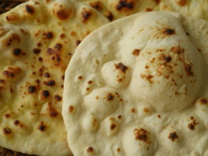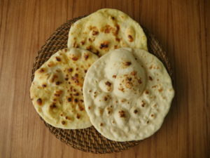 Knead dough again,grease hands with oil,take a dough and make a ball,sprinkle flour on working surface and roll out dough with the help of rolling pin and apply water on the surface (makes 4-5 Naans).