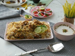 Add mint leaves,boiled rice,remaining prepared spice mix,fried onion,remaining boiled rice and ghee,cover & cook on high flame to build up the steam (4-5 minutes) then turn flame to low and steam cook for 25-30 minutes.