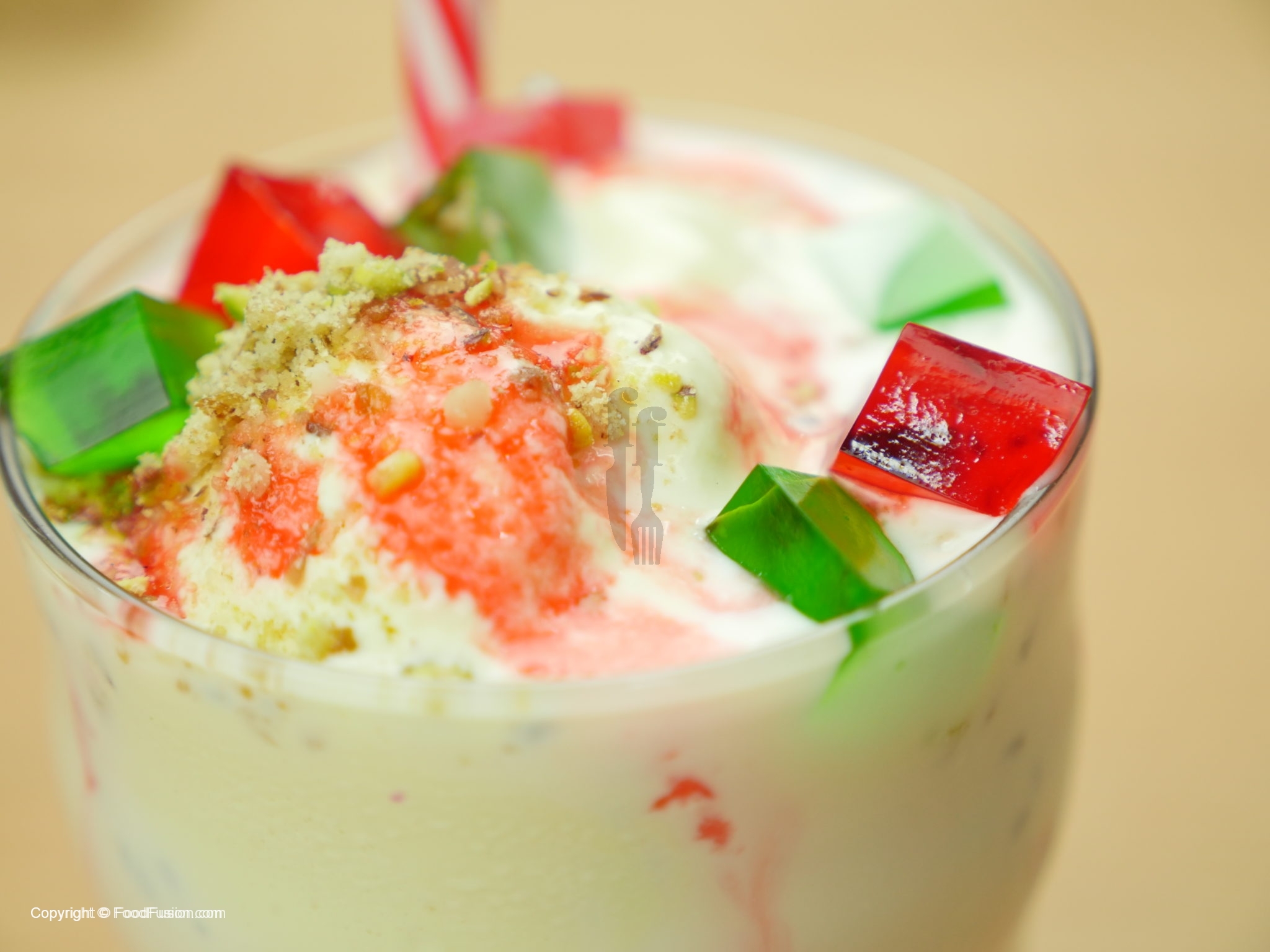 Glass mein lal sharbat,corn flour ki seviyan,tukh malanga,green jelley,red jelly,mix dry fruits,rabri (thickened milk),vanilla ice cream,red jelly,green jelly,mix dry fruits aur lal sharbat dal dein.