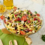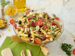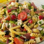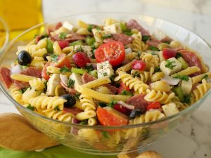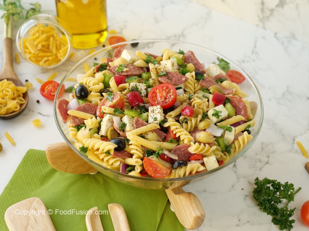 -Red bell pepper,kheera,black olives,green olives,cherry tomatoes,shimla mirch,beef pepperoni, pyaz,cottage cheese aur fresh parsley dal ker ache tarhan toss ker lein.