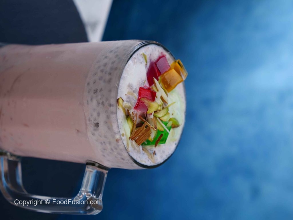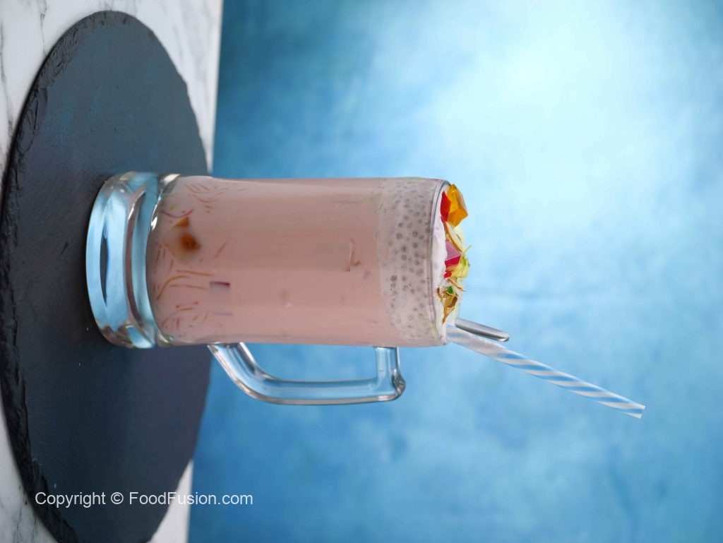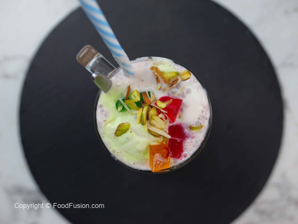 -In a pot,add ice cubes,basil seeds,colored vermicelli,fruit cocktail,red jelly,yellow jelly,green jelly, chocolate chip,white chocolate chip,condensed milk,pistachios,almond,pistachio ice-cream,vanilla ice-cream,khoya,chocolate syrup,roohafza milk & mix well.