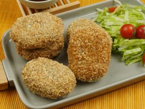 Now coat with all-purpose flour then dip into beaten eggs and coat with breadcrumbs (makes 12-13).
