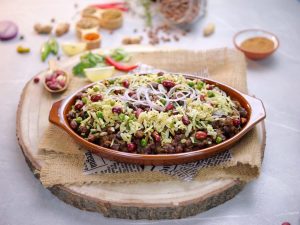 -In a serving dish,add cooked kalay chanay,chaat masala,fresh coriander,onion,prepared matar chewra & serve!