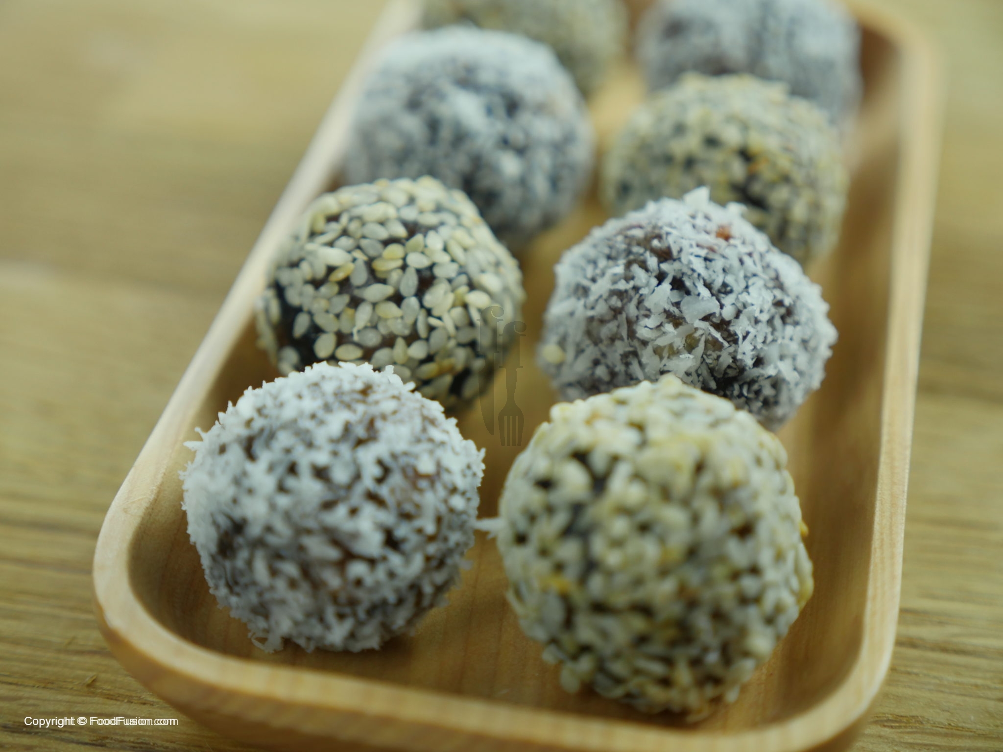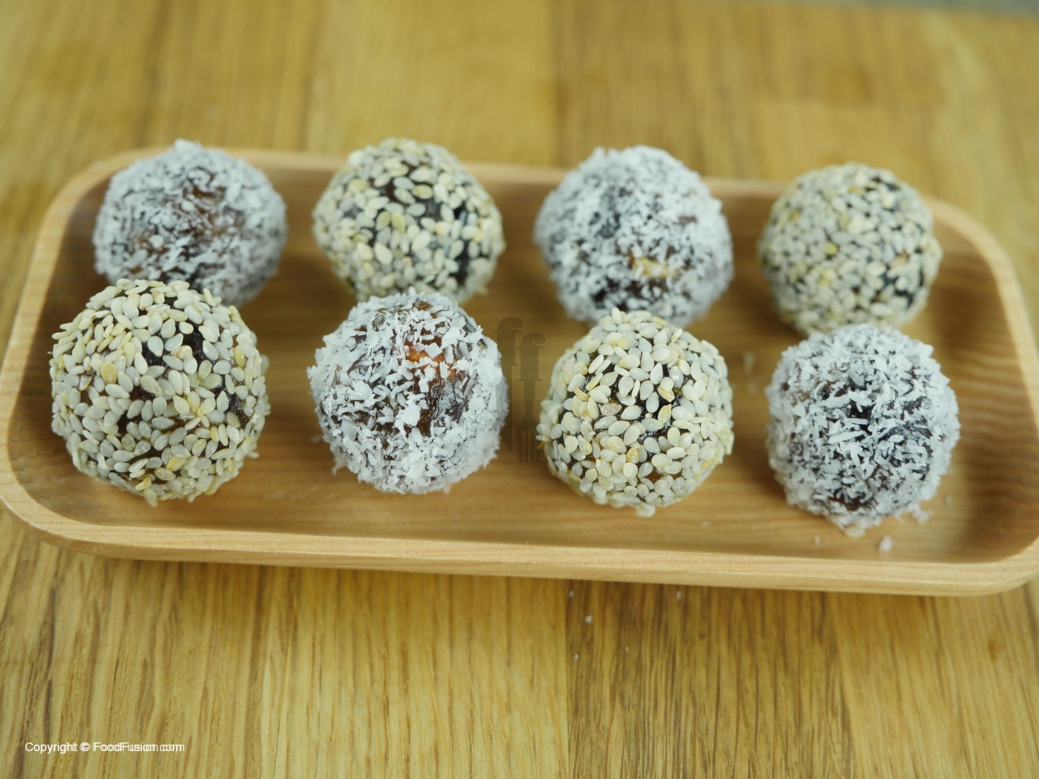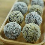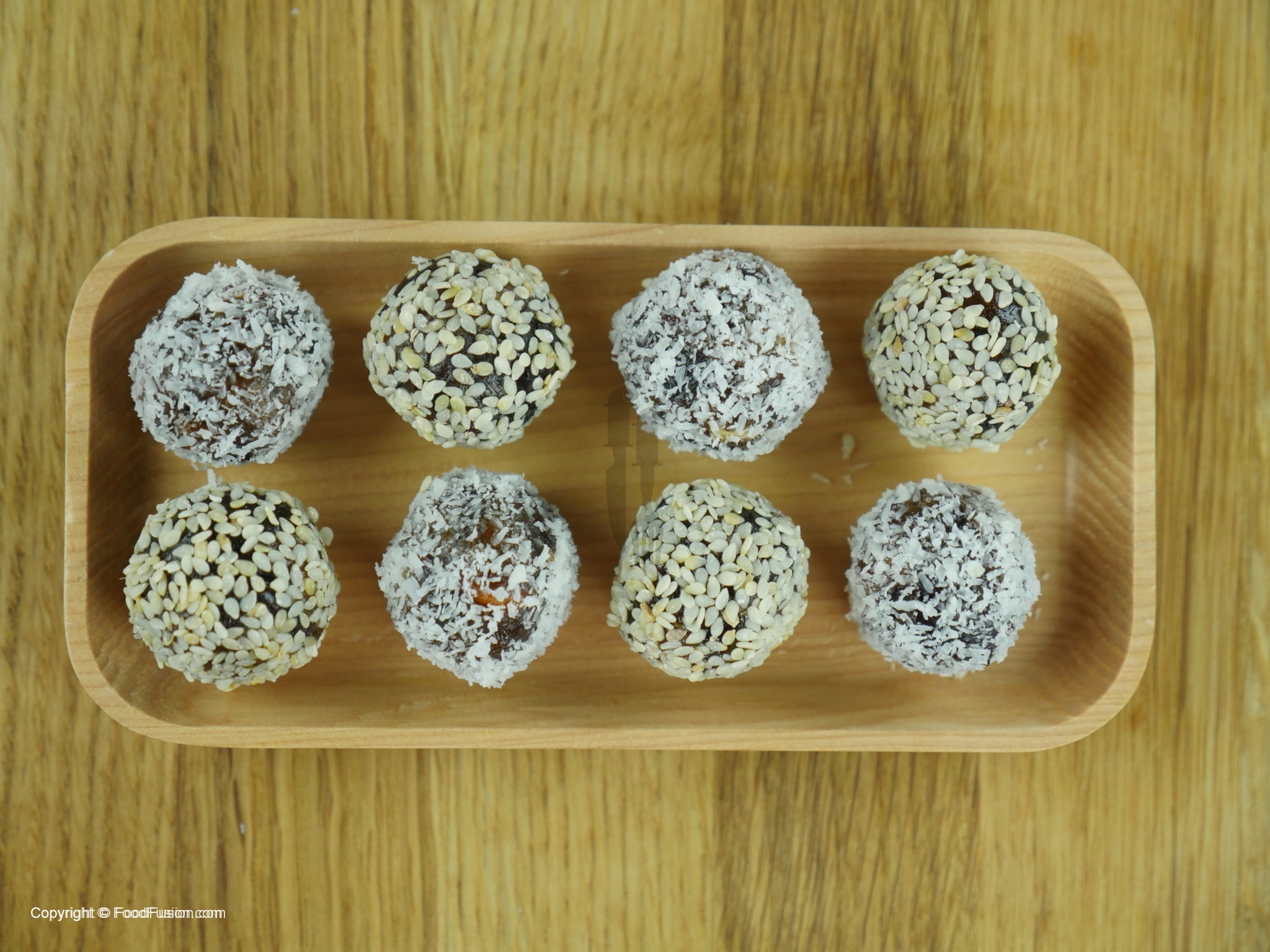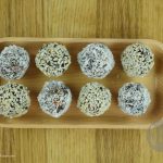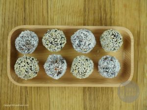 Khajoor Balls (dates) coated with coconut and sesame seeds